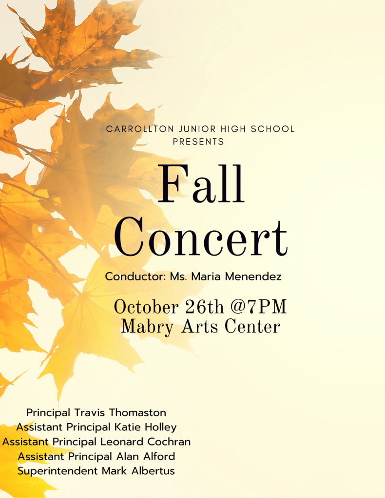 The students have been working so hard to prepare this concert for you all! We will have our first concert of the year next Tuesday at the Mabry Arts Center at 7 PM. All students are required to wear concert black. This concert is free and will conclude in less than an hour. All students are required to remain for the duration of the concert. Report time is 6:30 PM.